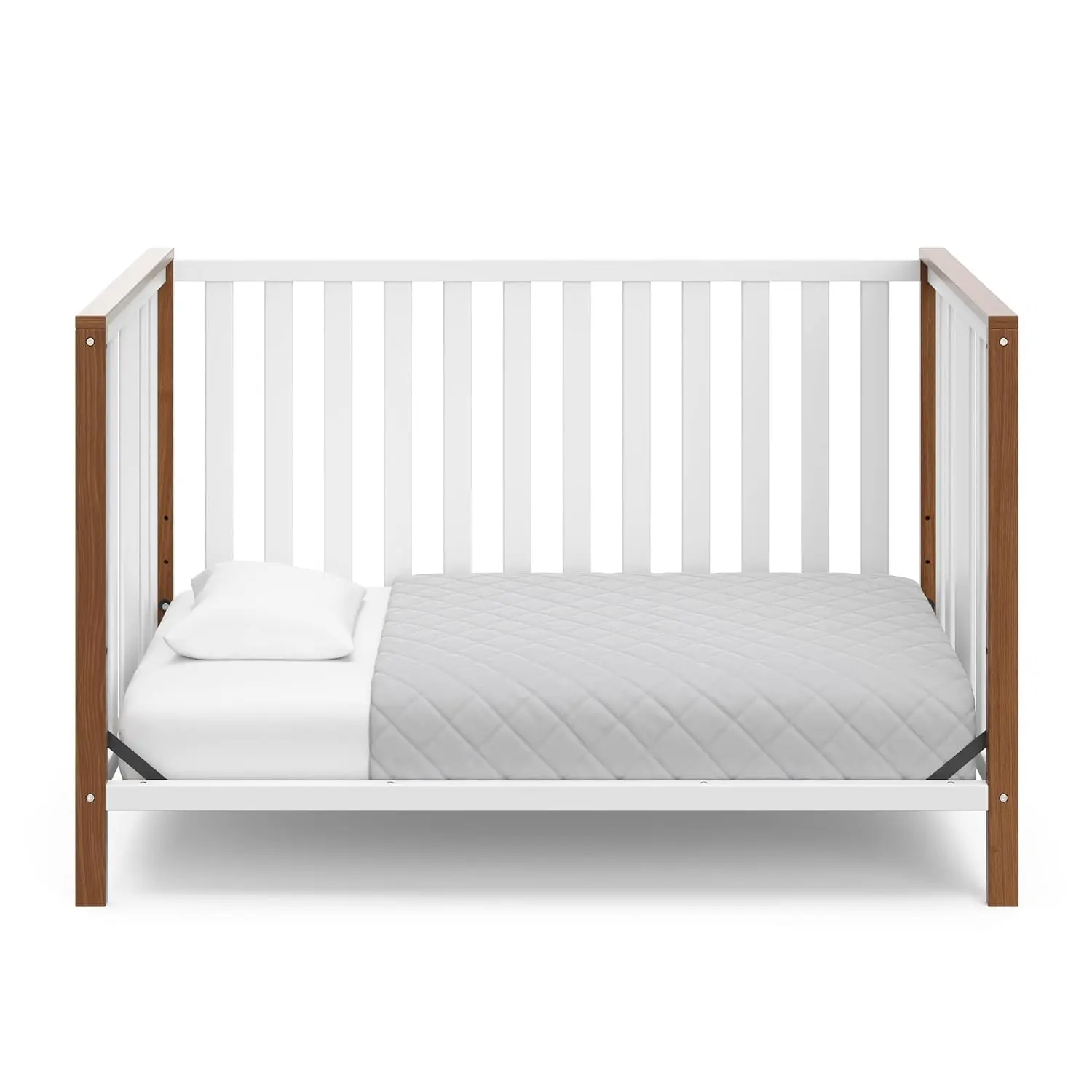 Create a stylish and safe nursery with the Modern Pacific 4-in-1 Convertible Crib in White with Vintage Driftwood accents. Designed for long-term use, this crib converts from a baby crib to a toddler bed, daybed, and full-size bed, growing with your child from infancy to childhood.