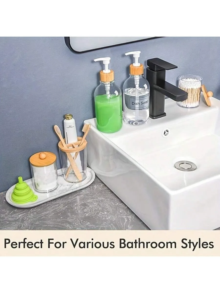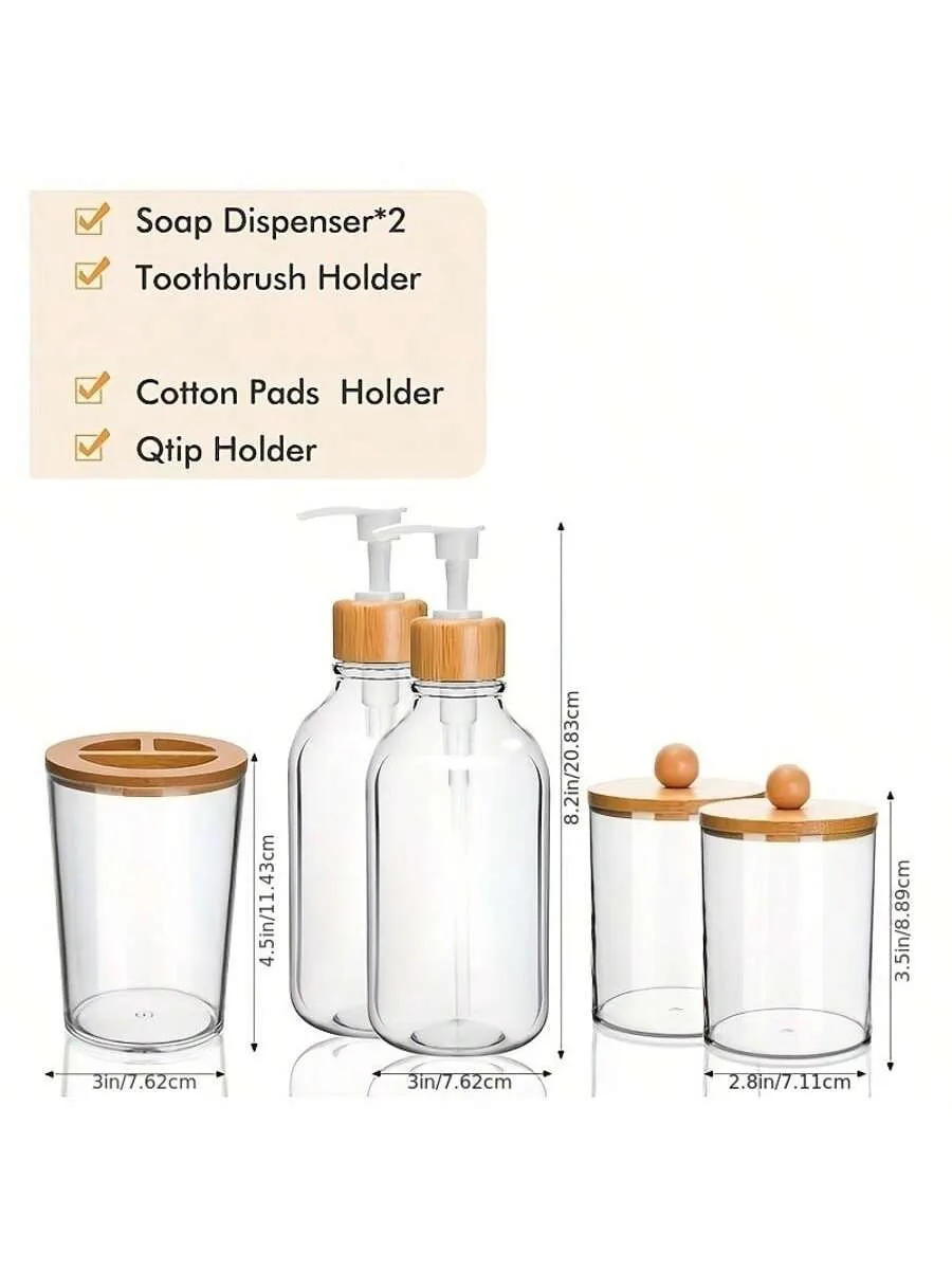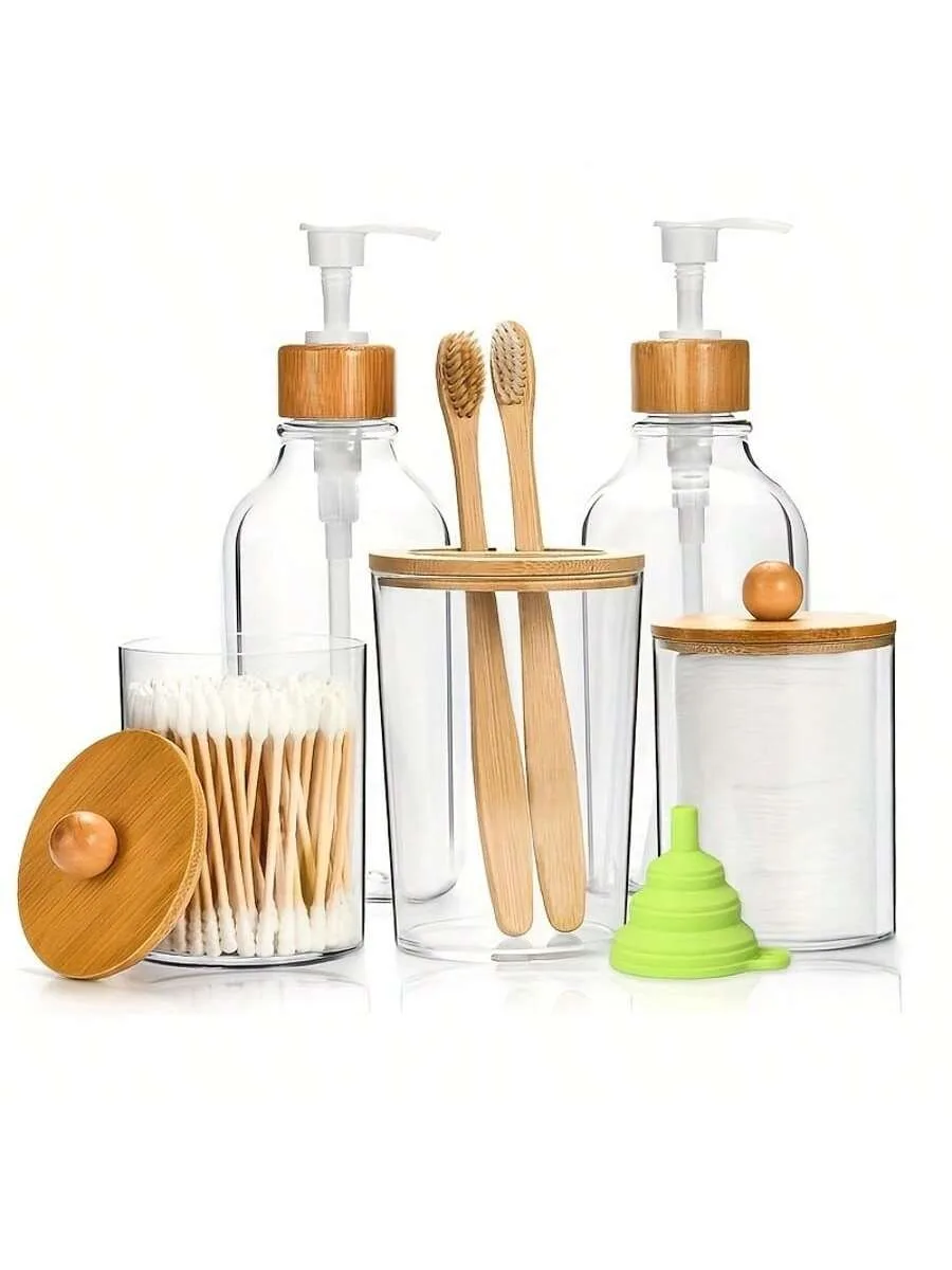 Organize your bathroom with this 6-Piece Bamboo Bathroom Accessory Set, combining elegance, functionality, and eco-friendly design. The set includes a soap dispenser, toothbrush holder, and Q-tip holder jars, all crafted with clear containers and bamboo accents for a modern, natural aesthetic. Durable and lightweight, each piece is designed for daily use while adding style to your countertop. The soap dispenser ensures smooth and easy dispensing, while the toothbrush holder and Q-tip jars keep essentials neatly organized. Perfectly sized for small and large bathrooms, it reduces clutter while maintaining a clean and minimal look. The clear containers allow you to easily monitor contents, making refills hassle-free. The bamboo construction adds warmth and sophistication, complementing contemporary, minimalist, and natural bathroom décor. Easy to clean and maintain, this set is both practical and visually appealing. Ideal for home bathrooms, guest bathrooms, or as a thoughtful housewarming gift, it combines functionality with sustainable design. Its cohesive design ensures a polished and organized appearance for your bathroom essentials. Upgrade your space with this bamboo bathroom accessory set, blending style, organization, and eco-conscious materials.