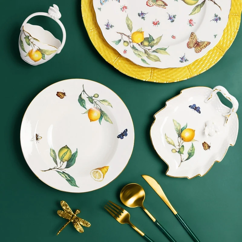 Brighten your table with this European Lemon Pattern Ceramic Dinner Plate and Bowl Set, featuring vibrant lemon designs that add a cheerful and elegant touch to any meal. Crafted from high-quality ceramic, these plates and bowls are durable, smooth, and easy to clean, making them ideal for everyday use. Perfectly sized for breakfast, lunch, dinner, or dessert, they are versatile enough for serving steak, fruit, candies, dim sum, or other Western-style cuisine. The colorful lemon pattern adds a fresh and playful aesthetic while maintaining a sophisticated European design. The smooth glazed surface ensures long-lasting use and resistance to stains or scratches. These plates and bowls are suitable for home kitchens, cafés, restaurants, or as decorative serving dishes during special occasions. Their functional yet stylish design makes them ideal for hosting brunches, tea parties, or casual dining. Lightweight and comfortable to handle, they combine practicality with visual appeal. Pair them with matching tableware for a coordinated look, or mix and match for a vibrant table setting. They also make a thoughtful gift for food lovers, collectors of ceramic tableware, or anyone who appreciates European-style kitchen décor. These dishes bring both functionality and aesthetic charm to every dining experience, creating an inviting atmosphere for family and guests alike.