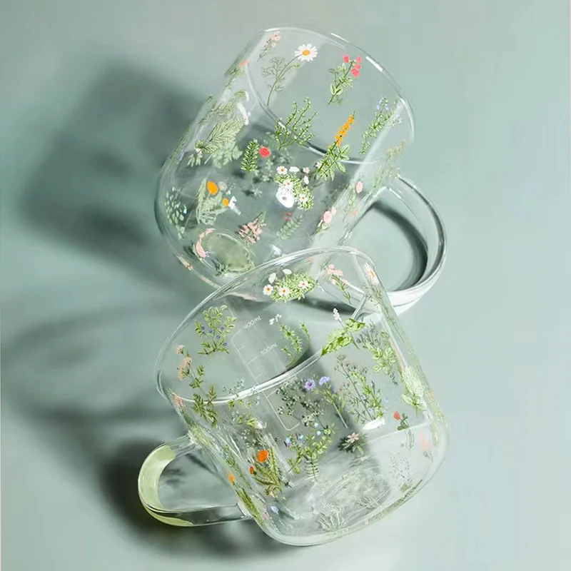 Enjoy your favorite beverages with this Transparent Glass Mug with Floral Printing, designed to bring beauty and practicality to your daily drinkware. Featuring delicate flower patterns on clear glass, this mug adds a charming and refreshing touch to every sip.