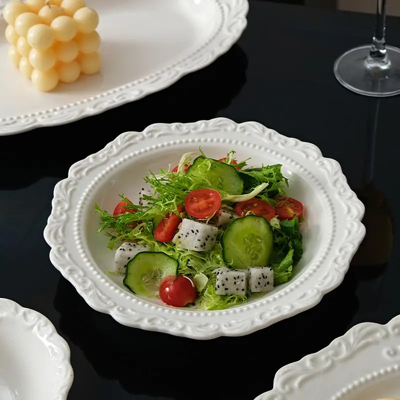 The French Ceramic Relief Dinner Plates offer a perfect blend of elegance and functionality for your dining table. Each plate is crafted from high-quality ceramic with a delicate relief design, adding texture and sophistication to every meal. The underglazed white finish gives the plates a subtle, vintage charm while maintaining durability and ease of cleaning. Ideal for everyday dining or special occasions, these plates are suitable for serving breakfast, lunch, dinner, or desserts. Their classic French aesthetic complements both modern and traditional kitchen décor. The embossed design not only enhances the visual appeal but also provides a tactile, luxurious feel. Lightweight yet sturdy, these plates are comfortable to handle while resisting chipping and wear. Perfect for family meals, dinner parties, or elegant gatherings, they elevate the presentation of any dish. The smooth surface allows for easy maintenance and effortless food release. Their versatile design makes them a thoughtful gift for weddings, housewarmings, or culinary enthusiasts. The timeless combination of white ceramic and intricate relief creates a refined look suitable for any table setting. Durable and stylish, these plates are designed to last while enhancing the aesthetic of your home. Bring French sophistication and exquisite craftsmanship to your dining experience with these vintage ceramic relief plates.