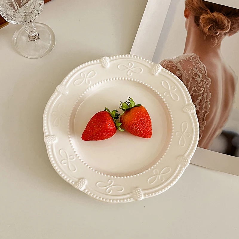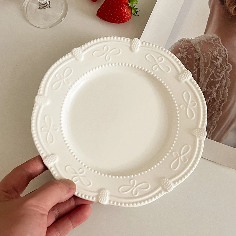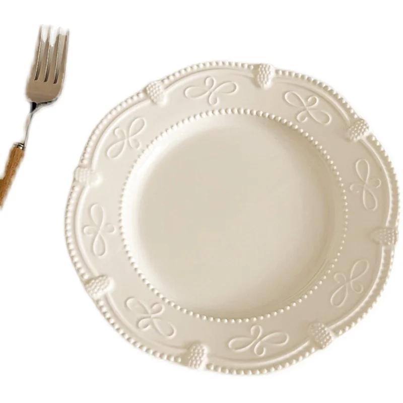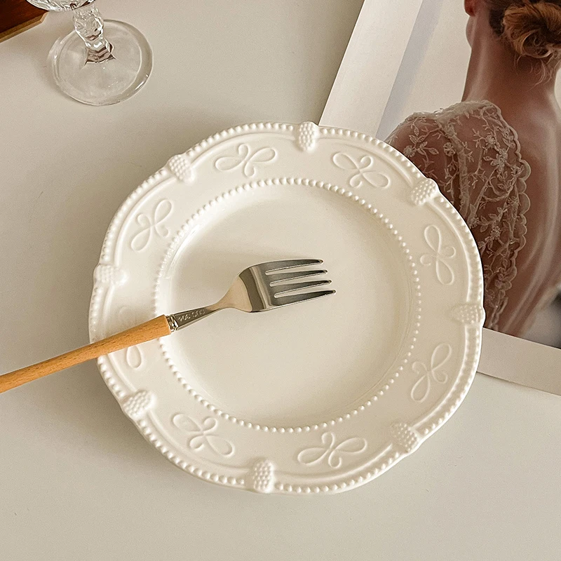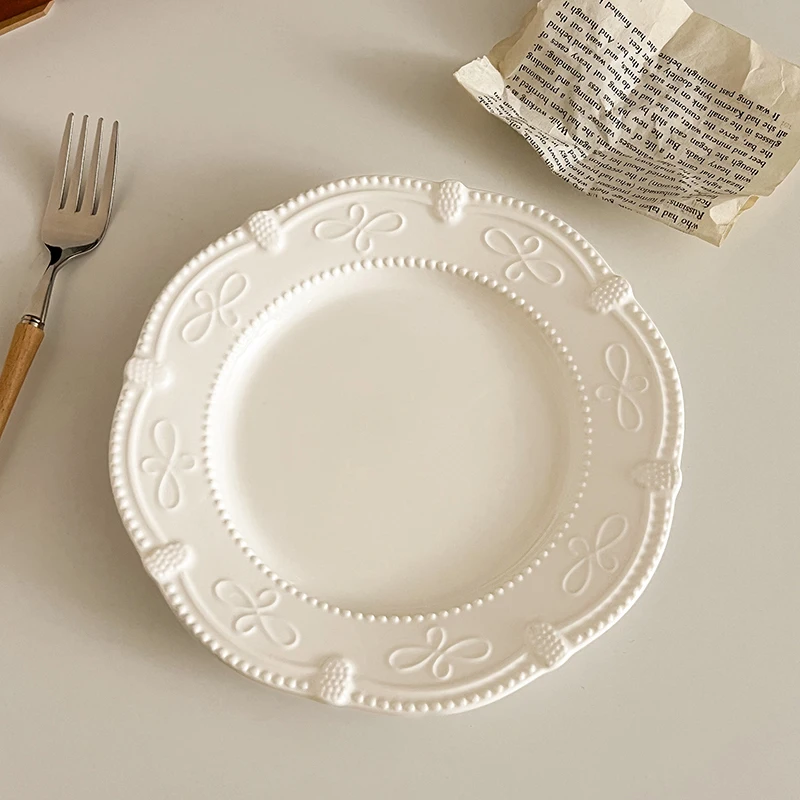 Serve your desserts and small dishes in style with this French Retro Relief Ceramic Dessert Plate, designed to combine elegance with practicality. The 7-inch plate features exquisite relief patterns that add texture and visual interest to your table setting. Crafted from high-quality ceramic, this plate is durable, smooth, and easy to clean, making it perfect for everyday use or special occasions. Ideal for serving dim sum, pastries, small salads, appetizers, or European cuisine, it enhances the presentation of your meals. Its classic white color complements any table décor while highlighting the delicate relief design. Lightweight yet sturdy, this plate is comfortable to handle and stackable for convenient storage. Suitable for household kitchens, cafés, restaurants, or dessert buffets, it brings a touch of vintage sophistication to any setting. The timeless design pairs well with other dinnerware for a coordinated table setup or stands beautifully on its own as a decorative piece. Resistant to scratches and fading, it maintains its beauty over time. Perfect for gifting, entertaining, or elevating your daily dining experience, this plate offers both functionality and refined style. Bring a touch of French elegance to your home with this charming retro ceramic dessert plate.