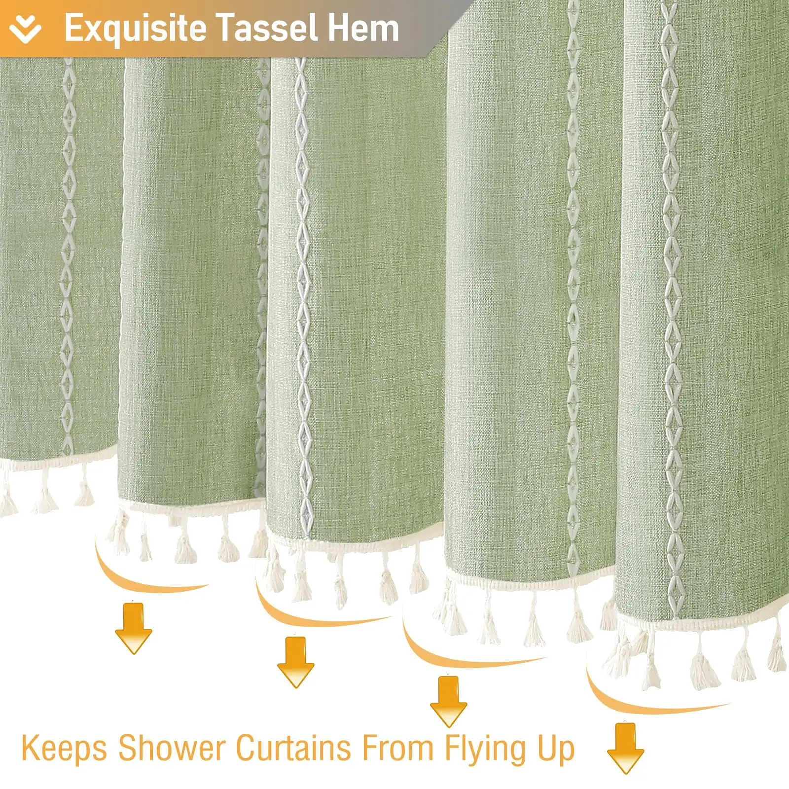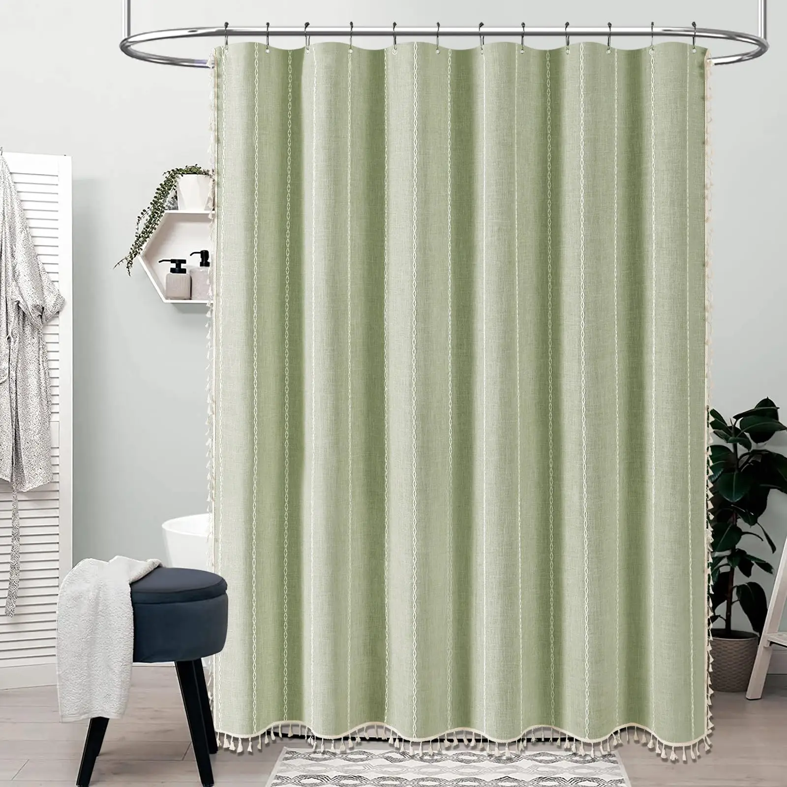 Elevate your bathroom with this Green Farmhouse Linen Shower Curtain, designed for both style and durability. Made from thick, high-quality linen fabric, it adds a rustic yet refined touch to your bathroom décor. The classic striped design complements farmhouse, bohemian, and country-inspired interiors. Decorative tassels along the edges enhance its aesthetic appeal, giving your space a charming and cozy vibe. The heavy-duty fabric ensures long-lasting use, providing both privacy and functionality. Perfectly sized for standard showers or bathtubs, this curtain set includes hooks for easy installation. Its natural linen texture adds warmth and sophistication while maintaining an eco-friendly profile. Easy to clean and machine washable, it retains its color and quality over time. Ideal for master bathrooms, guest bathrooms, or even as a decorative room divider. The thick fabric blocks water effectively while creating a visually appealing centerpiece. Pair it with matching bath mats or towels to create a cohesive look. Its soft yet sturdy construction ensures smooth draping and a luxurious feel. Upgrade your bathroom décor with this green farmhouse linen shower curtain, combining rustic charm, practical design, and boho elegance.