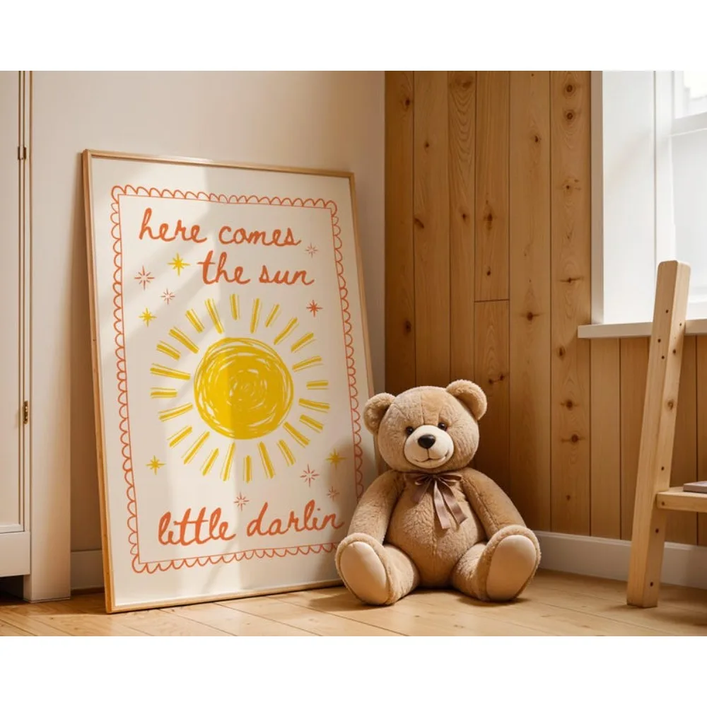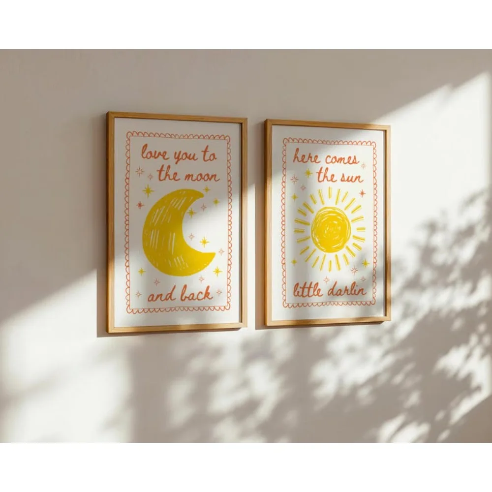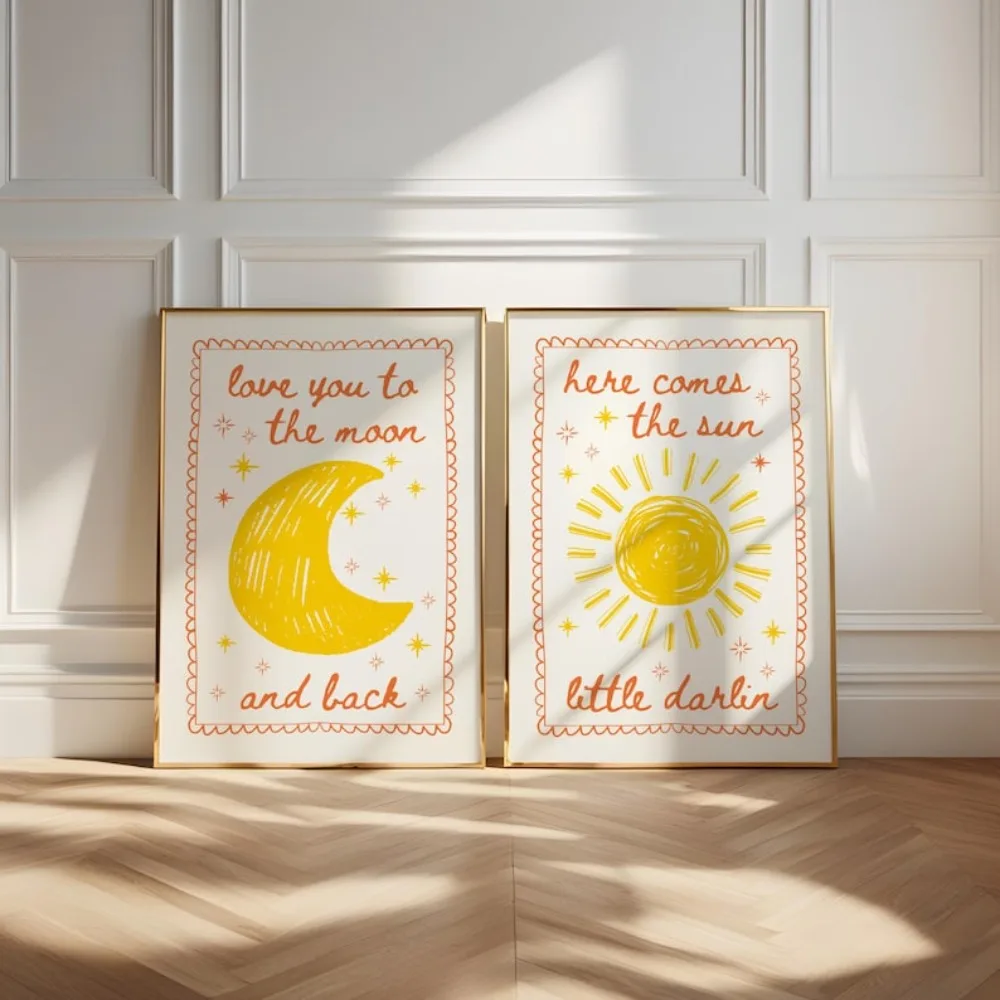 Create a warm, loving atmosphere with this “Love You to the Moon and Back” & “Here Comes the Sun” Art Print, designed to brighten children’s spaces with positivity and charm. Featuring soft yellow and beige tones, this artwork brings a calming yet cheerful feel to nurseries, kids’ rooms, and bedrooms.