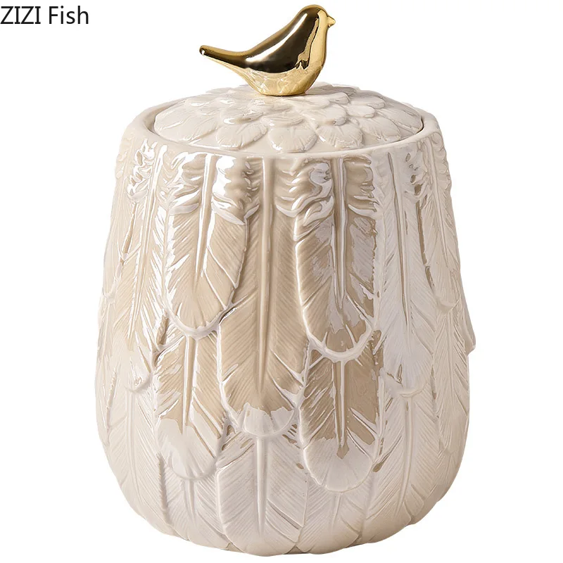 The jar features a luxurious golden bird feather relief design, blending Nordic minimalism with decorative sophistication. Its secure lid keeps contents fresh while enhancing the overall aesthetic of your home décor.