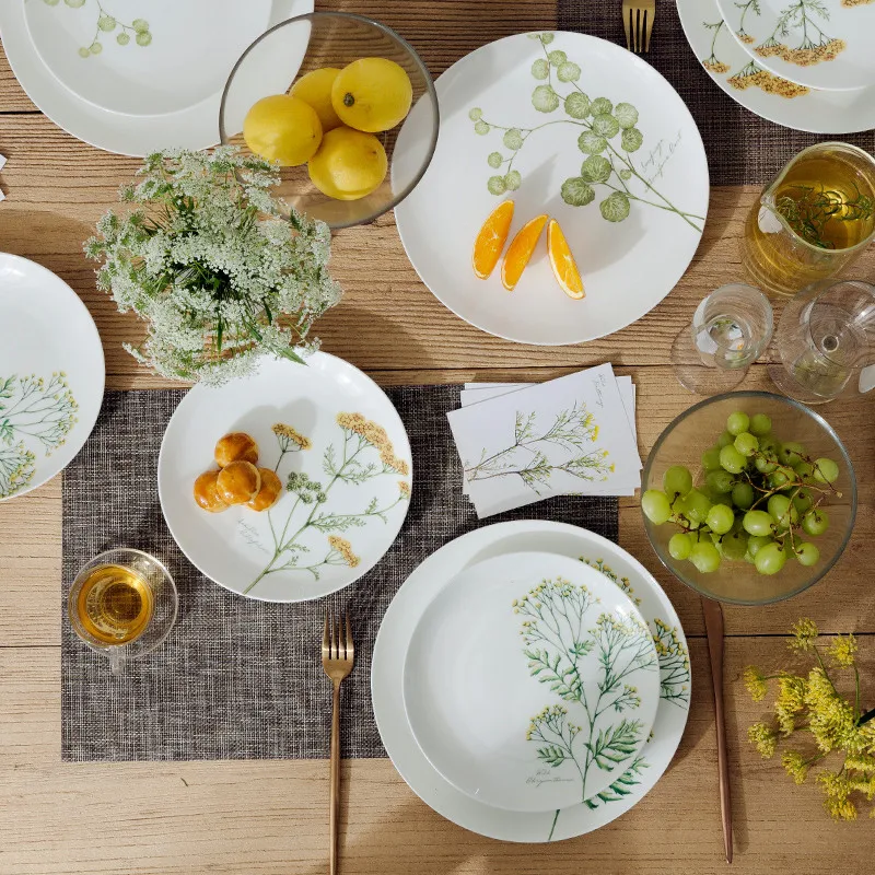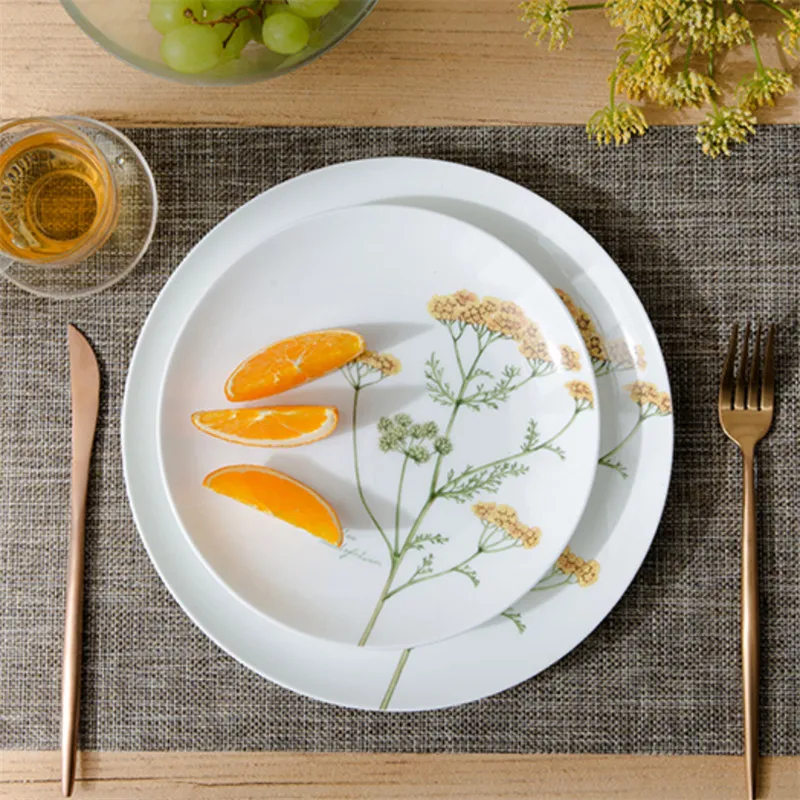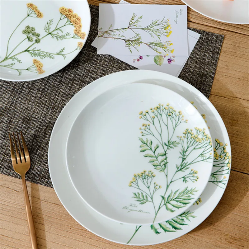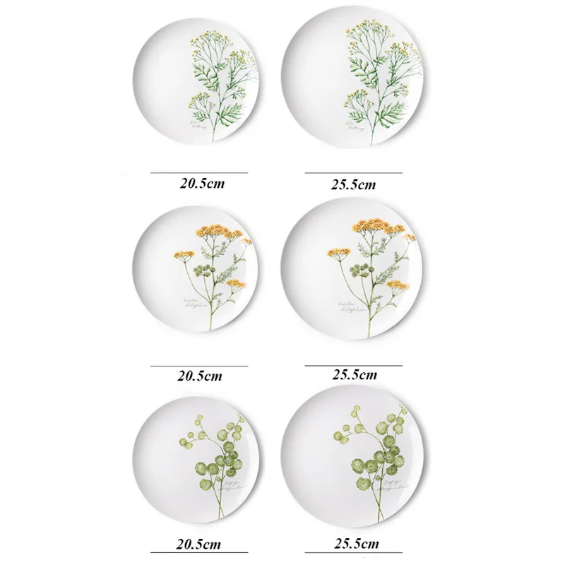 Bring elegance and simplicity to your dining table with this Nordic Plant Pattern White Porcelain Plate, crafted for both style and everyday use. Its minimalist Nordic design features subtle plant motifs, making it perfect for serving fruit, steak, salads, desserts, or other Western-style dishes. Made from high-quality porcelain and bone china, this plate is durable, smooth, and resistant to scratches, stains, and fading. The classic white base complements any table setting, while the delicate plant pattern adds a touch of sophistication. Ideal for home kitchens, cafés, or restaurants, it enhances the presentation of every meal. Its versatile size is suitable for casual dining, brunches, afternoon tea, or festive gatherings. The smooth surface makes cleaning easy, and the high-quality ceramic ensures long-lasting use. Lightweight yet sturdy, the plate is comfortable to handle and stackable for convenient storage. Pair it with matching bowls or other tableware to create a coordinated Nordic dining set. Its elegant aesthetic also makes it a thoughtful gift for housewarmings, weddings, or food enthusiasts. Perfect for modern, minimalist, or Scandinavian-inspired interiors, this plate combines functionality with refined design. Elevate your meals with this Nordic plant pattern porcelain plate, a stylish and practical addition to any home.