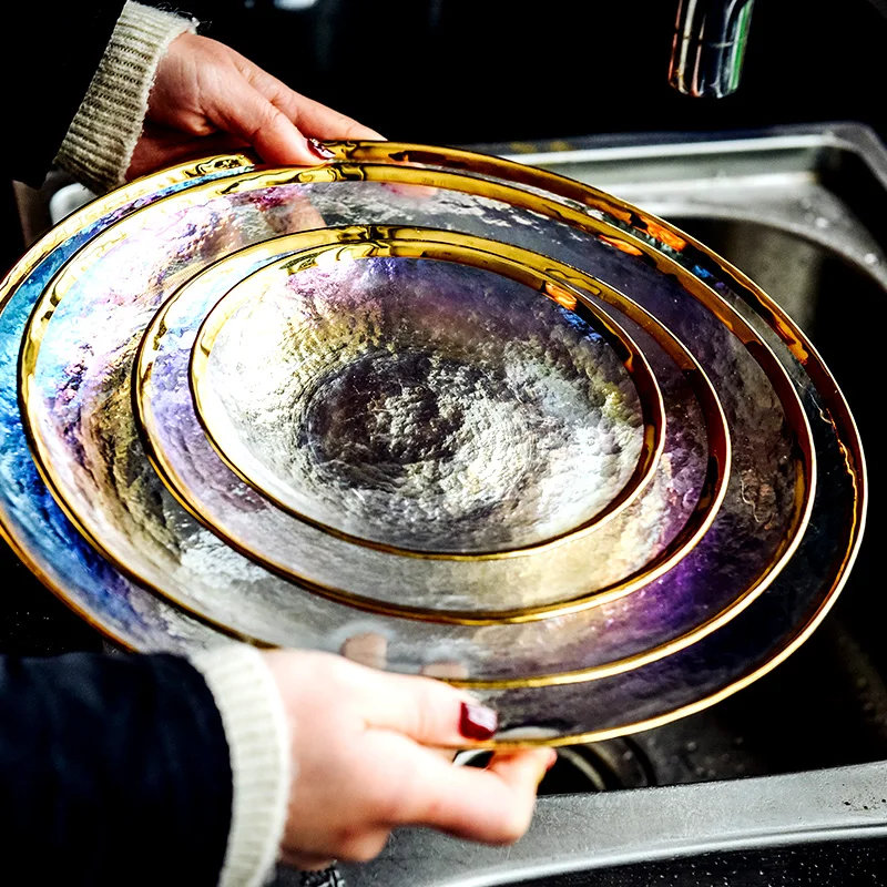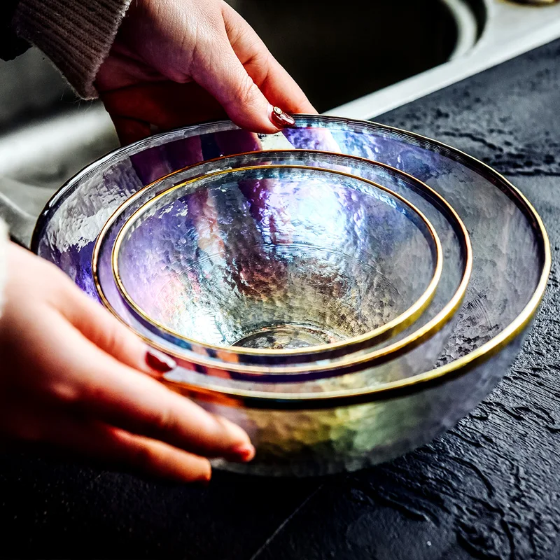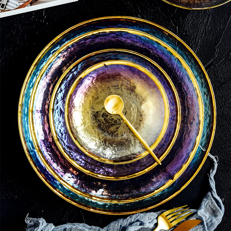 The Rainbow Glass Dinnerware Set is a vibrant and elegant collection designed to enhance any dining experience. This set includes dinner plates, salad dishes, bowls, and dessert trays, all crafted from high-quality clear glass with a chic gilt rim accent. The rainbow-inspired design adds a colorful and modern touch, making your meals visually appealing for everyday use or special occasions. Perfect for serving salads, desserts, main courses, or appetizers, this versatile set adapts to all types of dining. The smooth glass surface ensures easy cleaning and maintenance while maintaining its brilliant clarity. Ideal for home kitchens, dinner parties, weddings, or festive events, it adds a sophisticated flair to your table. Each piece is lightweight yet durable, providing elegance without compromising practicality. The gilt rim adds a luxurious touch, elevating even casual meals into stylish presentations. Stackable and easy to store, these plates and bowls save space while maintaining their decorative charm. The set’s versatility makes it suitable for modern, contemporary, or eclectic table settings. It also makes a thoughtful gift for weddings, housewarmings, or culinary enthusiasts who appreciate fine tableware. Brighten your table with this rainbow glass dinnerware set, combining functionality, durability, and aesthetic appeal in one stunning collection.