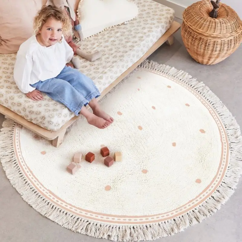 This Round Fluffy Carpet with Tassels brings softness, comfort, and adorable style to any room. Its plush, furry texture creates a cozy surface perfect for kids to play, crawl, or relax on. Designed in a clean white color, it brightens nurseries, playrooms, bedrooms, or living rooms with a soft, airy aesthetic. The charming tassel trim adds a touch of boho flair, making it both functional and decorative. Ideal for children’s spaces, this rug is gentle on delicate skin and provides a warm, cushioned spot for playtime. Its round shape fits beautifully under reading nooks, cribs, teepees, or small play areas. The rug is crafted with durable materials that maintain their softness and fluffy look even with daily use. Lightweight and easy to move, it works perfectly in any corner of the home. Create a warm, inviting space for your child—or add a cozy accent to your own room—with this soft and stylish fluffy tassel rug.