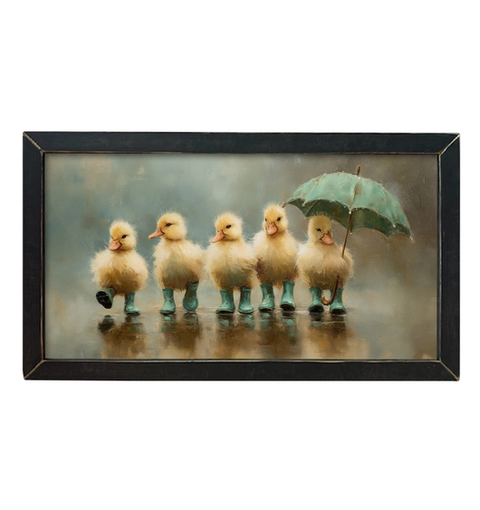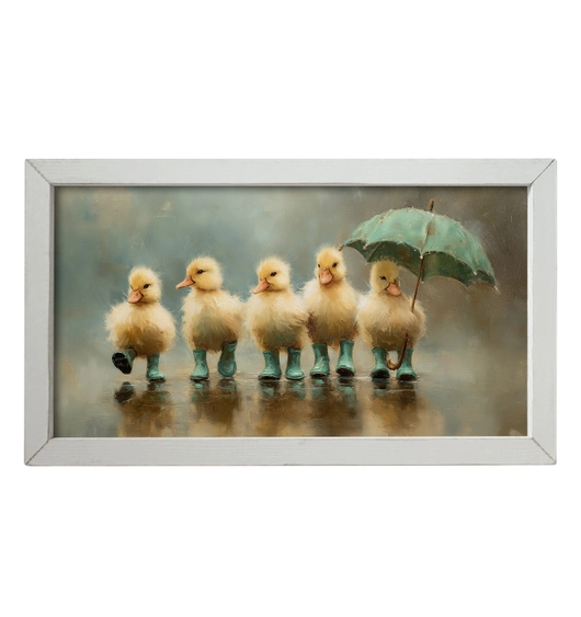 Add a little whimsy and farmhouse charm to your space with “5 Rubber Boot Ducks,” a playful framed art print featuring five fluffy ducklings wearing adorable teal rubber boots—one even holding a matching umbrella! With soft painterly texture, gentle neutral tones, and a sweet rainy-day mood, this artwork brings instant joy to any room. Perfect for laundry rooms, bathrooms, mudrooms, kitchens, nurseries, and cottage-style spaces, this print adds personality without overwhelming your decor. The frame adds approximately one inch to the overall size, making the finished piece about 17×31 inches. Available in three frame options, it’s easy to choose the best finish for your farmhouse, cottage, or country home style.